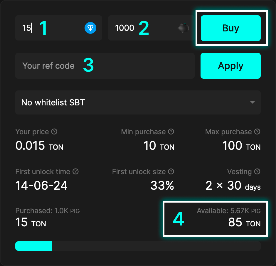 Для покупки токенов введите желаемое количество TON, которые вы хотите потратить (1), или жетонов, которые вы собираетесь получить (2). При наличии, вы также можете ввести реферальный код в поле, отмеченное цифрой 3. Ознакомьтесь с условиями и обратите внимание на максимально доступный для вас размер покупки (4), после чего нажмите на кнопку "Buy" и подтвердите транзакцию в кошельке.