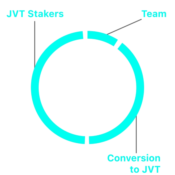 10% от комиссий платформы отправляется на кошелек команды проекта, в то время как 40% конвертируются в JVT и в последствии сжигаются, а 50% автоматически распределяется между стейкерами JVT за счет смарт-контрактов. Это первая в истории блокчейна TON реализация диведендной модели, позволяющая распределять доход среди холдеров жетона и работающая полностью автономно.