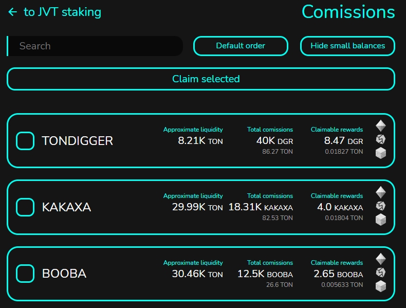 Все стейкеры JVT участвуют в распределении части комиссий платформы. Для получения своей доли от доходов сервиса необходимо нажать "Claim commissions", отметить все доступные вам токены, которые вы желаете получить, и затем подтвердить транзакцию в кошельке.
